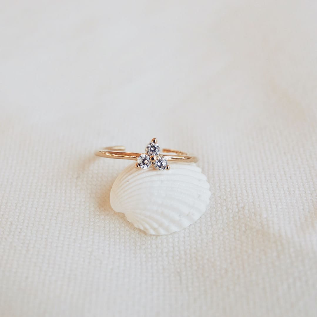 Un trio de zircon en forme d’étoile sur une base fine et classique. Elle est réglable et en plaqué or 3 microns.