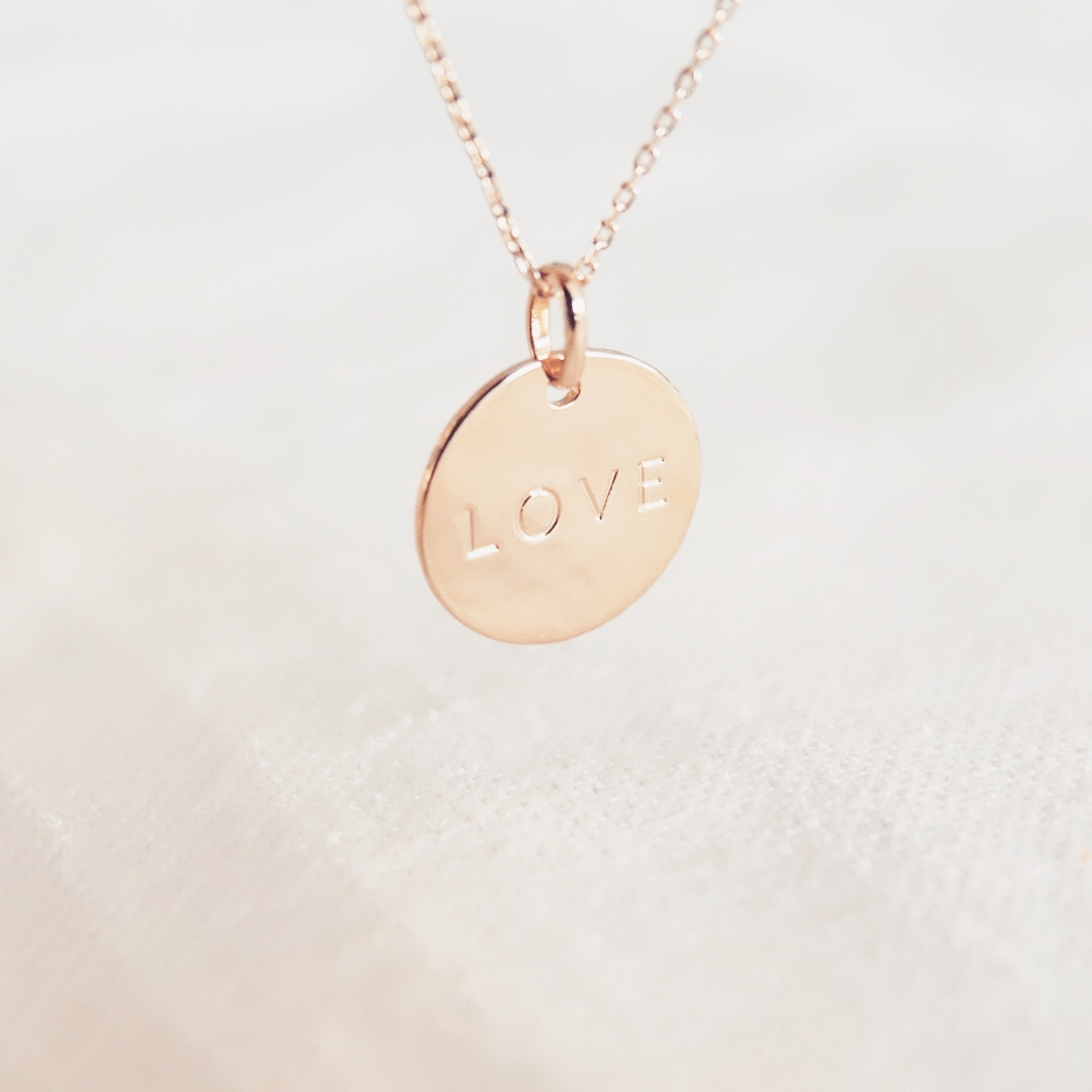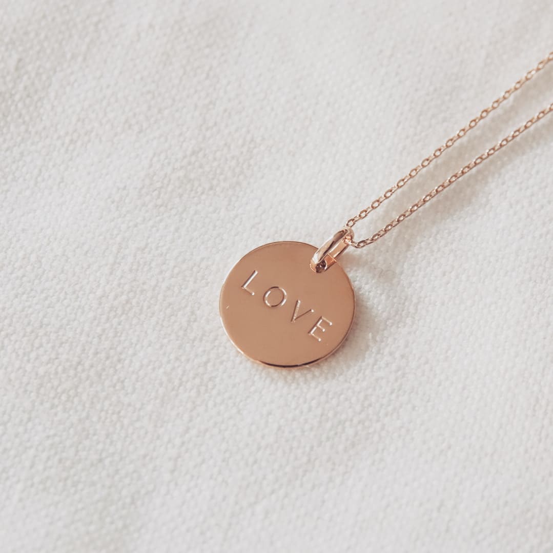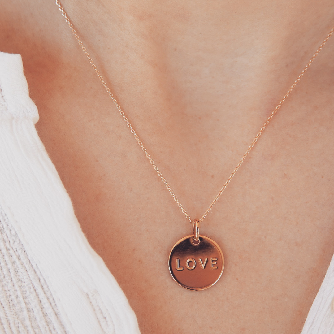 Chaîne en maille forçat en plaqué or jaune 18 carats et son pendentif gravé du mot « love »